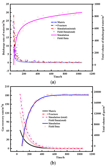 In the hydraulic fracturing process, the water injection flow rate was not recorded. Therefore, the water flowback rate and amount were used for verification. As shown in Figure 6a, it could be observed that the simulation results are in good agreement with the field data both for flow rate and total amount. The total amount increases rapidly within 400 h, then gradually flattens, and then stabilizes after 1000 h, which is close to 890 m3.