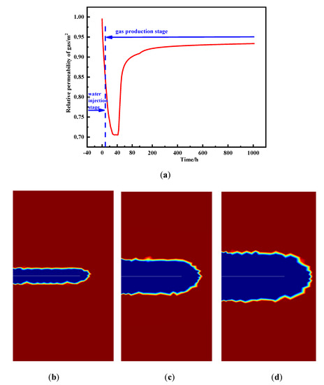 Variation of the relative permeability of the gas phase with time (a), Gas-phase saturation distribution at the water injection stage t = 1 h (b), 5 h (c), and 10 h (d).