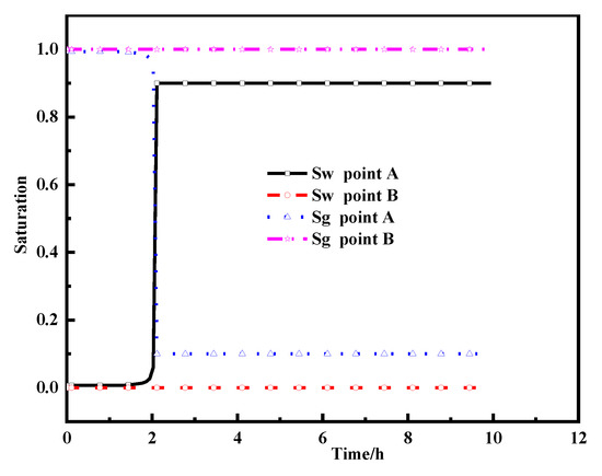 Two points were selected to illustrate the variations of gas relative permeability evolution with the point A is in the water saturation area and Point B is out of the water saturation area shown in Figure 3. As Shown in Figure 8, the saturation sum of the water phase and the gas phase is equal to 1. The initial state assumes that the water saturation of the system is 0, and the saturation of point A starts to increase at 2 h and quickly reaches fully saturation state. At the same time, the gas phase saturation of point A decreases rapidly from the initial value of 1. Since point B is far away from the main fracture, its water saturation remains at 0 at the end of water injection, which is exactly consistent with Figure 7d. This characteristic also demonstrates that at the end of water injection process, a large amount of area without water infiltration exists.