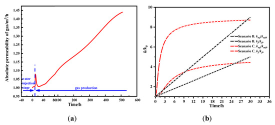 The variations of intrinsic permeability were shown in Figure 9a below. Results indicate that: (1) In the water injection stage, the intrinsic permeability gradually increases with time since the internal pressure of the reservoir gradually increases, which further causes the effective volumetric strain of the coal body to increase, and eventually the intrinsic permeability of the coal body continues to increase. (2) In the gas extraction stage, the intrinsic permeability of the gas phase gradually decreases with time, and then rebound. The first decrease is caused by the decrease of fluid pressure and the later increase is caused by the decrease of the adsorption strain because of the gas desorption.