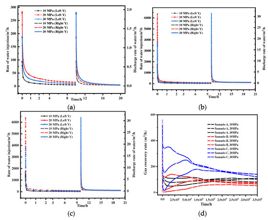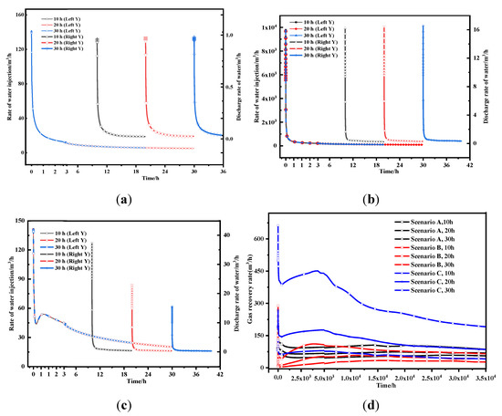 The water injection rate of (a) Scenarios A, (b) Scenarios B, (c) Scenarios C and (d) the gas production rate of the three scenarios.