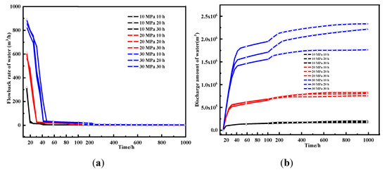 Generally, the water injection rate gradually decreases and stabilizes with the increase of the water injection time. This directly illustrates that the water injection rate is not directly related to the total length of the water injection time, and also indirectly reflects that the fracture permeability is not related to the length of the total water injection time. In addition, the reverse discharge rate of water increases with the extension of the total water injection time as shown in Figure 9a.