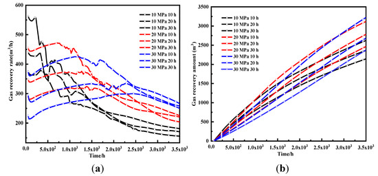 Through comprehensive comparison, it is determined that the working condition of 30 MPa-10 h is the optimal working condition when the extraction time is 10 h. With the extension of the water injection time, the water saturation of the reservoir will gradually increase, which will adversely affect the drainage during the extraction phase; while the water injection pressure will increase the absolute permeability and promote the gas recovery rate during the gas recovery phase, it will also cause the water injection volume in the water injection stage to increase and the water saturation of the reservoir to be higher. This further proves that the initial conjecture in the presented study, that is the effect of hydraulic fracturing on the extraction stage, cannot be ignored.