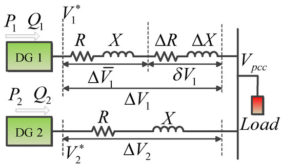 In a MG, the performance of reactive power can be impacted by the feeder impedance mismatch. The impedance installed in between the DG power source and the bus will decide the voltage drop of the feeder, and ultimately impact the reactive power sharing performance. Consider two DGs in a connected MG as shown in Figure 3, where taking the voltage at the point of common coupling (PCC) as the reference, the voltage drop is described by: