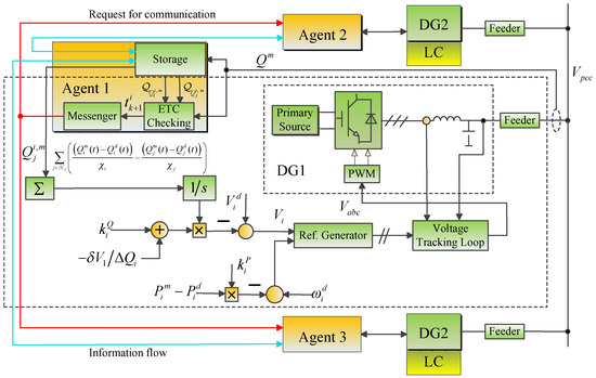 Incorporating the ETCP proposed previously and the adaptive droop coefficient, the general power sharing control framework structure is shown in Figure 4. The typology of DG1, DG2 and DG3 shown in Figure 1 is taken as an example for illustration purpose. In Figure 4, the agent is responsible for establishing between neighboring DGs.
