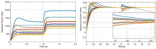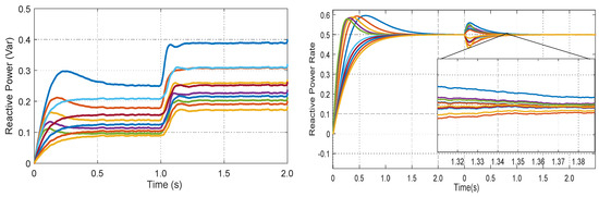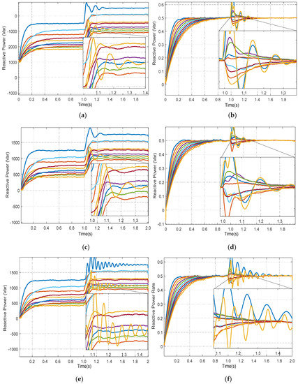 Simulation results for reactive power output of 10 DGs with time delays: (a,b) for time delay ; (c,d) for time delay ; (e,f) for time delay .