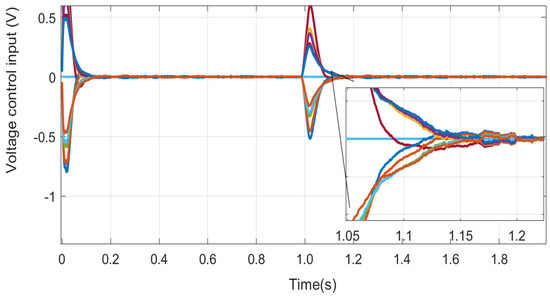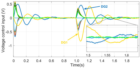 It is necessary to analyze the impact of communication time delay on the performance of the proposed method. It is assumed that time delays happen between agent 1 and agent 2 with delay values: , and . The time delay happens when there is a load step change at time node . Simulation results with the three time delays are shown in Figure 11, Figure 12 and Figure 13.