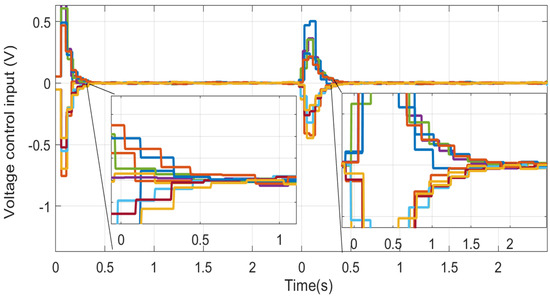 It can be seen from Figure 11 that when the time delay happens, it takes the agents longer time to reach the new consensus state, and the time for convergence increases if the delay time becomes larger. Figure 12 and Figure 13 show the control input with PC and ETCP with time delay . Obviously, the control input lasts longer before converging to a stable value if there is time delay.