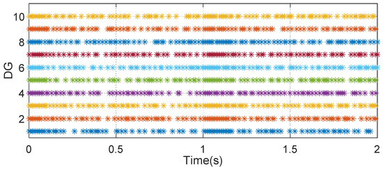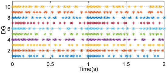 The main difference of Equation (11) and Equation (4)–Equation (5) is that in Equation (12), the control input can make use of either the updated information from the neighboring agents, or the stored information of the neighboring agents in the previous triggering instant. For example, if , will remain to be the stored information in the previous triggering instant, namely, ; otherwise, will be updated to the novel state, namely, , where the value of is determined by Equation (11a). With such mechanism, the event triggering principle is integrated into Equation (12). In such manner, the MG requires less communication among agents. The proposed triggering instants with the ETC is given as:
