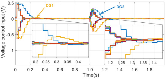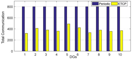 Firstly, it is essential to test the performance of the proposed method under load step change. The DGs are connected with different local loads ranging from 800 VAr to 2 KVAr. To show the improved performance of the proposed approach, the period communication (PC)-based distributed control model in [4] is selected for comparison purpose. Figure 5, Figure 6, Figure 7, Figure 8, Figure 9 and Figure 10 show the simulation results of both methods under load step change. From time to , the DGs are connected with 55% of the total rated load; at instant , the total load increases to 80% of the rated level. It can be seen from Figure 5 and Figure 6 that both methods show similar behaviors in reactive power sharing, and consensus of the DGs can be achieved in the advent of load step change. Figure 7 and Figure 8 show the control input with PC and ETCP. Obviously, when ETCP is adopted, the control input will be held to the same value in between two consecutive time instants until the ETC is satisfied. In this way, the communication between the neighboring agents is reduced to a certain level, as shown in Figure 9. Figure 10 compares the total numbers of communication with PC and ETCP. It can be figured out that the agents with PC require the same numbers of communication, while the numbers of communication with ETCP is diversified but much less than those of the PC. Hence, the effectiveness of the ETCP in communication reduction and performance maintenance is verified.