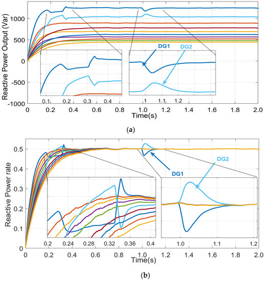 It can be observed from Figure 21a,b that when the type (a) failure happens, the DGs can still reach consensus for power sharing as the communication between five DGs is still linked. From Figure 21c,d, it can be observed that if DG 1 is isolated from the communication link, it cannot reach consensus with the other four DGs, as there is no communication link between DG1 and the other DGs. Nevertheless, after the communication failure is cleared, DG1 can still reach the consensus state for reactive power sharing. Meanwhile, when the type (c) communication failure happens, i.e., two connected DGs are isolated from the communication network, two different consensus states can be achieved, as shown in Figure 21f.