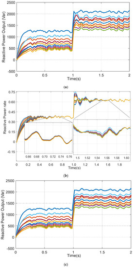 where , , . Suppose that the first two DGs in Figure 3 have the same power ratings and the active and reactive powers are shared, then , which indicates that is the voltage drop mismatch in the feeders of the two DGs. The voltage drop mismatch will result in errors in reactive power sharing across different DG units. Hence, one solution to further enhance reactive power sharing performance is to eliminate the voltage drop imbalance term in Equation (25). Considering Equation (3), and adding an adaptive term in the droop coefficient and we have: