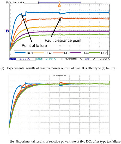 To show the validity of the proposed method in the real environment, experiments are conducted. In this study, the experimental platform consists of five DGs with the same rated power of 20KVA. The system parameters can be found in [19]. The DGs have communication links between them with the ring topology and they are controlled by a central controller, as shown in Figure 20. In this case, we check the validity of the proposed method when the DGs network experiences communication failure as demonstrated in Case 5.3 in the simulation. The type (a), type (b) and type (c) communication failures in Figure 14 are considered in the experimental setting. At time , the type (a) and type (b) communication failures are initialized in the communication failure respectively, and the failures are clearly at time . The experimental results are shown in Figure 21a,b and Figure 20c,d. Moreover, in order to show how the system reacts toward longer communication failure duration, the type (c) failure is initialized at and the failure is cleared at time . The corresponding experimental results are shown in Figure 21e,f.