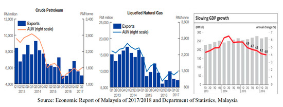 Crude Oil and Liquefied Natural Gas Exports for period of Q1: 2013 to Q2: 2017 and GDP growth slowing.