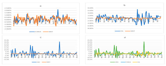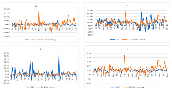 According to Energy Information Administration (EIA) [34,35], “Malaysia is the world’s third-largest exporter of liquefied natural gas and the second-largest oil and natural gas producer in Southeast Asia”. On average, oil and gas industry has been growing by over 7.0 percent during the last 10 years and the industry contributes more than 25% to government’s annual revenue. However, the recent world’s oil and gas market shocks of 2015–2016 had resulted in tremendous decline in total export value of crude oil and liquefied natural gas from Q2: 2015 to Q2: 2016, as shown by Figure 1, which had also affected government’s revenue negatively. Hence, the slowdown of the country’s economic growth. Later, as oil and gas price started to recover, the export value of both crude oil and liquefied natural gas also started to grow from Q3: 2016: to Q2: 2017. Additionally, like many other oil exporting economies [36], the stock market returns of Malaysia are also affected by oil price shocks [25]. Figure 2 shows that returns of the Malaysian stock market moves with changes in oil price, gas price, and exchange rate. These are clear indications that changes in oil and gas prices are associated with stock market performance as well as export revenues of the Malaysian government, particularly those generated from the oil and gas sector.