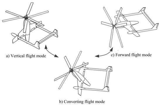 The speed limit of a conventional helicopter is normally below 350 km/h [1] due to its inherent aerodynamic characteristics; e.g., the tip stall of the retreating blade and compressibility effects of the advancing blade. New concepts of rotorcraft design compounded with fixed wings have been put forward to break this speed limit. These conceptual rotorcrafts combine both the capabilities of conventional helicopters, such as vertical takeoff and hovering, and fixed-wing airplanes, such as the long range of cruising and large payload performance. An example of these conceptual designs is the Bell/Boeing V-22 Osprey [2], the first production tiltrotor in the world. The V-22 Osprey is capable of vertical take-off and landing, and its maximum flight speed is up to 509 km/h. Later, the innovative design of a mono tiltrotor (MTR) was proposed [3], in which only one rotor is used, combining the concepts of a tiltrotor and coaxial rotor. The original design of an MTR, which innovatively combines the concepts of a tiltrotor and coaxial rotor, is presented in Figure 1. In particular, a contra-rotating coaxial rotor system is employed in this aircraft to achieve high aerodynamic performance with a compact structure. Compared with traditional helicopters, a coaxial rotor is able to fulfill torque trim without a separate anti-torque tail system, and it has a relatively high aerodynamic efficiency [4]. Benefiting from these advantages, the coaxial rotor design has been widely applied in shipboard helicopters, micro unmanned helicopters [5], advanced high-speed compounded helicopters [6], etc. The present MTR integrates a coaxial tiltrotor system, two fixed wings, a fuselage and a twin-boom tail system. It distinguishably uses a coaxial rotor to change from a lifter to a propeller by converting from the vertical/hovering flight mode to forward/cruising flight mode. When converting between different modes, the coaxial rotor shaft, wing and fuselage are fixed to each other, tilting through several hinges with the support of a twin-boom tail system. This convertible wing supplies enough lift and results in a high lift-to-drag ratio in cruising state. The lift-to-drag ratio is expected to be more than twice the ratio of a conventional helicopter [7].