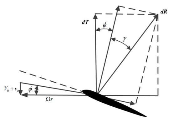 In the boundary element step, for a single blade element, as shown in Figure 2, the incremental thrust of the rotor disk ring, , can be derived by the given lift and drag coefficients of the airfoil.