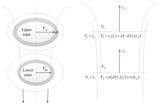By solving Equation (6), the radial velocity distribution can be obtained. For the MTR, the induced velocity cannot be directly solved by the separate BEMT equivalent equation of the upper and lower rotors because of the interference. An interaction model between the upper and lower rotors can be constructed based on BEMT, and the mode schematic is shown in Figure 3. The Biot–Savart law shows that the induced velocity evolves with the axial spacing d as follows [7]: