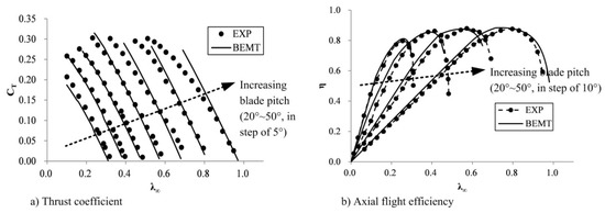 The propulsive efficiencies are demonstrated in Figure 5b, with blade pitches from 20° to 50° in a step of 10°. A linear dependence of and is predicted by BEMT at low inflow ratios, which is consistent with the experiments. Overall, the BEMT is also a reliable tool for the modeling of a coaxial rotor in axial flight.