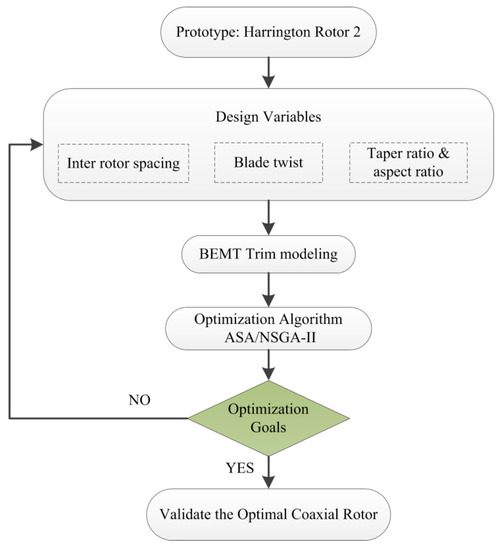 The realization of the current method can be described by the following flow chart in Figure 9. It includes two major modules: i.e., the trim modeling by BEMT and the optimization design.