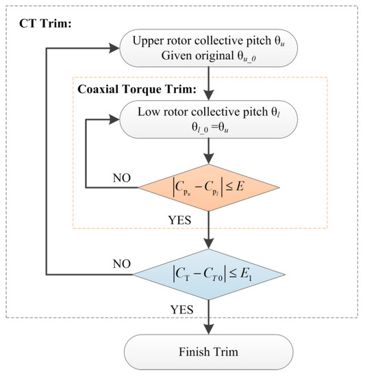 A design process coupling BEMT modeling and optimization algorithms was constructed, as shown in Figure 6. The goal was to find the optimal blade parameters with the highest efficiency for the MTR system. In this process, a design point—e.g., the thrust coefficient, , with a certain magnitude—should be decided first. The trim of both thrust and inter-rotor torque (i.e., the non-dimensional total power coefficient of upper rotor and lower rotors, and ) should be fulfilled. In particular, thrust trim was achieved by adjusting the collective pitch of the upper rotor, and torque trim was satisfied by adjusting the corresponding lower rotor’s collective pitch. The classic dichotomy method in [24] was utilized to solve the trim procedure, and the convergence was determined by the tolerances and , as shown in Figure 7.