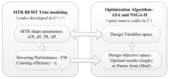 For the module of trim modeling, the authors developed the BEMT code based on the theory as illustrated in Section 2.1 and Figure 7 in the manuscript. For the module of optimization design, both algorithms (ASA and NSGA-II) were employed from the well-developed theories [24,26] and open source codes. The detailed procedure is as follows: first, the initial values of shape parameters, such as d/R, dθ, TR, AR, are input by the designers, which are shared to the design variables space of the optimization design module. Second, the hovering performance FM and cruising efficiency η can be solved by BEMT trim modeling, and the results are then sent to the design objective space of the optimization algorithm module. Third, the optimization algorithm will decide the design parameters of the next group/generation and feed back to the BEMT trim modeling module. This circle is actuated by optimization algorithms and does not stop until the preset generation number is finished. This optimization project can be implemented in existing design optimization platforms such as Isight software and Artap [34] to validate the results.