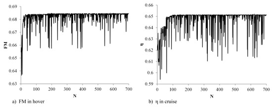 Two single-objective optimization cases for the current MTR in hovering or in cruising states are conducted. For the target thrust coefficient, the hovering trim is and cruising trim is . The trim tolerances are set as and , respectively. Both single-objective optimization cases are based on the ASA optimization algorithm with 700 samples.