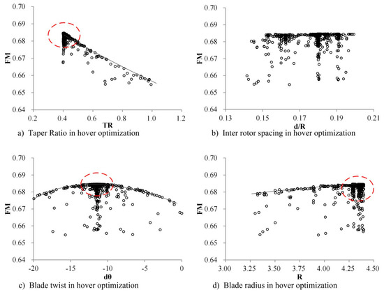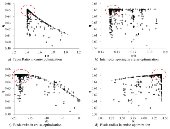 Figure 11 and Figure 12 illustrate the design parameter distribution versus objectives of all the samples. All the design parameters gather to certain values (marked with a red circle in each figure), which are given in the third and fourth columns in Table 4. Several points can be observed in the optimization results: 1) the optimal taper ratios for both hovering and cruising cases reach the lower constraint limit, since smaller TRs contribute to more uniformly induced velocity distributions along each blade; 2) the optimal radii for both cases are close to the upper constraint limit—obviously, longer and thinner blades have less inter-blade interference; 3) the best linear blade twists for the hovering case (−11.4) and cruising case (−18.2) are divergent, which results from their different reset trim thrusts—a suitable blade twist design can decrease the induced losses on the coaxial rotor, and it can distinctly delay flow separation at the blade root and stall at the blade tip, which will contribute to a more uniform load distribution on each blade [10]. However, a large blade twist will be unproductive, since it induces more serious flow stall along the blade; 4) for inter-rotor spacing, distinct gathering can be seen in the cruising case, which is at the lower limit 0.14, but no clear trend is found in hovering case. Compared with the previous three design parameters, the inter-rotor spacing has a relatively weak influence. According to the intrinsic mechanism, a larger spacing may contribute to less interference losses, but it also leads to higher profile drag with a higher exposed shaft.