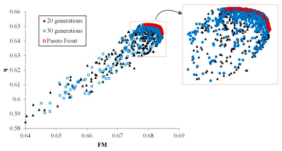 In the multi-objective optimization process, the figure of merit (FM) in the hovering sate and the propulsive efficiency (η) in the cruising state are chosen as objective functions. Sensitivity analysis under different sets of generation numbers was implemented for the multi-objective optimization. Two optimization cases with 20 and 30 generations (both with population size N = 40) have been carried out, respectively. The results in Figure 13 show that the 30-generations case shares a similar Pareto Front to the 20-generation results, which indicates that 20 generations are sufficient in the current optimization. The following analysis will focus on the case with 20 generations.