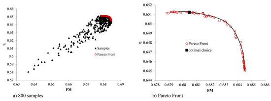 Figure 14a shows the detailed multi-objective optimization results which are obtained by the NSGA-II algorithm, where a total number of 800 samples is utilized to obtain the last Pareto Front (Figure 14b). Among all these samples, the maximum FM for the hovering case is 0.6845 and the maximum η for the cruising case is 0.6513. They appear in different design samples, and both of them are smaller than those in the single-objective optimization cases. Designers can make trade-offs among the design points on the Pareto front. For example, if the cruising performance is investigated, an optimal design from the optimized cruising side of the Pareto front can be selected, as marked in Figure 14b. This optimal design has almost the highest cruising efficiency with a moderate hovering FM. This specific example design has been used as a case study and in the parameter analysis in the following sections. The parameter comparison of the original and optimized rotor (optimal choice in Figure 14b) is listed in the second and fifth columns of Table 4.