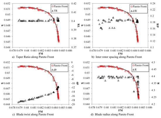 Figure 15 demonstrates the design parameters along the Pareto front in the current multi-objective optimization. TR is around 0.4 along the entire Pareto front (Figure 15a), which is consistent with the single-objective optimization results. In Figure 15b, when the Pareto front inclines to the cruising-optimized side, the distribution of the inter-rotor spacing is relatively scattered, and it converges to 0.18 when it moves towards the optimized hovering side. Figure 15c indicates that larger blade twists (a larger absolute value of ) are more suitable for cruising, whereas relatively smaller twists are better for hovering. The last sub-figure shows that most of the optimal blade radii along the Pareto front are close to 4.40. Besides, radii within the range of 4.25 to 4.40 are also suitable for hovering.
