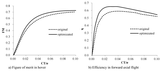 Under the presupposed design point—i.e., hovering trim and cruising trim —the optimized MTR has a performance of FM = 0.6805 and η = 0.6512. Compared with the original rotor (FM = 0.6343, η = 0.5745, for coaxial rotor 2 in [4]), FM and η have been improved by 7.3% and 13.4%, respectively. It is also worth mentioning that a compromise design is directly obtained from the multi-objective optimization, while the single-objective optimizations always present biased designs (as shown in the last two rows in Table 4) with either a worse FM or a worse efficiency.