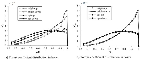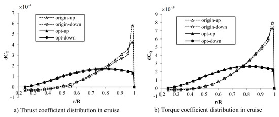 Figure 17 and Figure 18 illustrate the span-wise load distributions—i.e., the thrust coefficient, , and torque coefficient, —on the upper and lower rotors of the original and the multi-objective optimized MTR, respectively. In these figures, solid lines with solid symbols are the results of the optimized MTR, and dashed lines with hollow symbols are those of the original rotor. In addition, the triangle symbols correspond to the upper rotor and circular symbols correspond to the lower rotor. Figure 17a shows that most of the upper rotor thrusts are larger than the lower ones, which results from the effects of induced speed in the hovering state, while in the cruising state, as shown in Figure 18a, the upper rotor thrust distribution is very close to the lower one because, at that time, the inflow caused by forward speed plays a dominant role. For the torque distribution in the hovering state, as shown in Figure 17b, distributions on the upper and lower rotors remain consistent with each other due to the torque trim in the optimization process. The same phenomenon is seen in Figure 18b for cruising flight. In conclusion, compared with the original MTR, the optimized MTR has a much more uniform load distribution along the blade span, which contributes to much better performance both in hovering and cruising states.