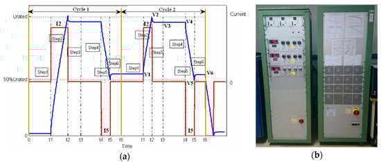 The capacitance and ESR estimation method used is the one proposed by the manufacturer and it is based on the assumption that EDLC model can be represented by a simple RC equivalent circuit. In [14] it is explained how to calculate both the C and the ESR. Figure 4a shows the voltage profile referred to time applied to SCs to calculate the C and the ESR [15]. As a continuous power source, a Digatron BTS-600 (Digatron, Aachen, Germany), displayed in Figure 4b, has been used to characterise the SCs. This power source allows one to charge/discharge the SC cells from half the nominal voltage until the nominal voltage with a current of 100 A and an error of 0.01%.