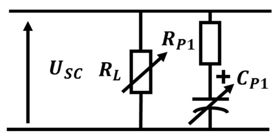 Using these results, an approximation of the SC voltage evolution with respect to time could be done. As mentioned before, manufacturers provide only the maximum value of the leakage current, which is given to nominal voltage in the supercapacitor. The lower the voltage in the SC, the lower this leakage current. For this reason, the leakage current could be modelled as a variable shunt resistor in function of the voltage in the SC. However, this sole element is not enough to properly represent the leakage current and the process of redistribution of the electrical loads. The electrical circuit that best models the leakage current and the redistribution of the charges is a resistance (RL) in parallel with a resistance (Rp1) connected in series with a capacitor (CP1) as is shown in Figure 7. The capacitance value and the resistance is variable with the voltage. This element connected in parallel to the rest of the electrical circuit model the SC behaviour at very low frequency. The value of these parameters and the rest of the electrical circuit will be discussed in Section 4.