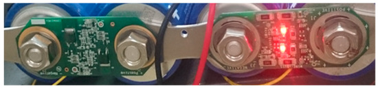 Four SCs connected in series with the active balance board in “standby mode” (left one) and in “on mode” (right one).