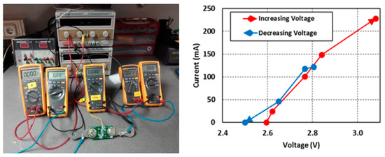 When the voltage in the cell is above 2.6 V a certain quantity of current drains through a resistor in a voltage balance circuit, presented in Figure 11 connected in parallel with the SC., in order to discharge the cell. The higher above 2.6 V the voltage, the higher this current. The evolution of this current with voltage is shown in Figure 11. The voltage balance circuit response was obtained with a laboratory source.