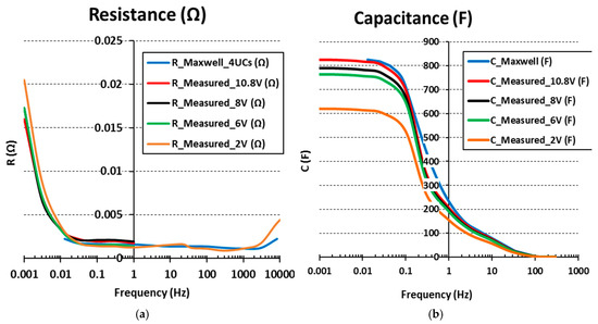 The experimental results obtained for one single cell are shown in red in Figure 9. This result is compared with the experimental data provided by the manufacturer (blue line). Manufacturer data are given for a single BCAP3000 cell charged to 2.7 V at 25 °C. The resistance of the connection plates is not included, so it is necessary to add its value to the provided input data. On the other hand, it is worth mentioning that the manufactured only provides data from 0.013 Hz to 10 kHz, so below and above these frequencies there is no reference values to compare the experimental results against. Finally, the manufacturer only supplies the impedance magnitude versus frequency and the imaginary impedance versus frequency. From these two graphs, the resistance and the capacitance versus frequency evolutions need to be obtained. For frequencies below 0.1 Hz, it is very difficult to calculate the resistance from Maxwell curves without errors because the capacitance (hundreds of Farads) is much higher than the resistance (hundreds of μΩ). The experimental resistance and capacitance values are compared in Figure 9a,b respectively. The capacitance value is very similar in both cases: the value obtained experimentally and the value supplied by the manufacturer. However, in case of the resistance, the differences are greater. Especially for frequencies below 0.03 Hz and above 500 Hz. The capacitance value is maximum below 0.01 Hz and it begins to considerably decrease from 0.03 Hz. The resonance frequency is located around 80–100 Hz, where the SC begins to have inductive character.