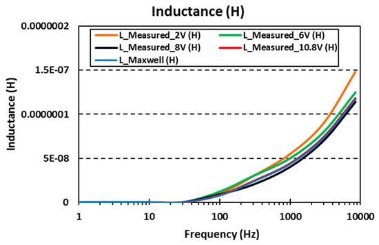 In order to evaluate the influence of the voltage on the capacitance, the resistance of the connection plates and the voltage balance circuits, four cells of SCs have been connected in series to experimentally determine the frequency response. Four different cases have been studied depending on the preload voltage (Vbias) in the SCs (2 V, 6 V, 8 V and nominal voltage 10.8 V). The total measured resistance and capacitance (RTOT = 4·RSINGLE and CTOT = CSINGLE/4) for each case compared with the data supplied by the manufacturer are shown in the Figure 12a,b. The total inductance as a function of the frequency is shown in the Figure 13. As only data of one cell is available from the manufacturer, it is necessary to extrapolate the resistance, the capacitance and the inductance values for four cells connected in series, including the resistance of the connection plates.