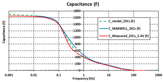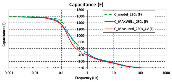 Comparison in the frequency response of the measured capacitance and the value obtained from the electrical circuit model of the two SCs charged to 2 V. The capacitance value provided by the manufacturer is also plotted (blue line).