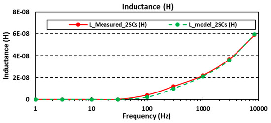 Comparison in the frequency response of the measured inductance and the electrical circuit model of the two SCs charged to 2.7 V.