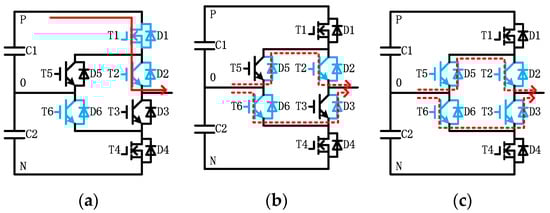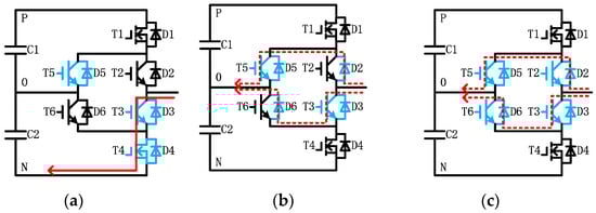 In the proposed modulation, three switching status are designed as listed in Table 1. They can output three different voltage levels: P, O, N. In the P state, T1 and T2 are turned on, and the output voltage is Vdc/2. The O state is that the middle four tubes T2, T3, T5, and T6 are all turned on, and the voltage output is zero through two parallel circuits (T5/D5 and T2/D2, T6/D6 and T3/D3). In the N state, T3 and T4 are turned on, and the output voltage is −Vdc/2. The waveforms of the proposed modulation scheme are shown in Figure 1b. In the positive half cycle of the modulation wave, when the modulation wave is larger than the triangular carrier, T1 outputs a high level, while T3 and T5 output a low level. T2 and T6 are always high level during the positive half cycle of the modulation wave, and T4 is always low level. In the negative half cycle of the modulation wave, when the modulation wave is larger than the triangular carrier, T2 and T6 output high level, while T4 outputs low level. T3 and T5 are always high level during the negative half period of the modulation wave, and T1 is always low level.