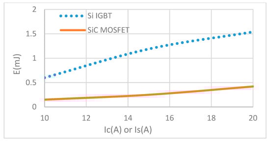 Switching energy curves of silicon (Si) IGBT and silicon carbide (SiC) MOSFET at 25 °C.