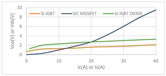 Due to the synchronous rectification characteristics of the MOSFET, the on-state loss of its body diode is ignored. Therefore, this section does not compare the on-state characteristics of MOSFET body diodes. In Figure 5, the typical output characteristics of IGBT (25 °C VGE = 15 V) and its anti-parallel diode and MOSFET (25 °C VGE = 14 V) are proposed. The on-state loss of a power device was obtained by multiplying the current flowing through it and the voltage across the device when passing this current. Figure 5 shows the voltage change curves of Si IGBT, SiC MOSFET and the anti-parallel diode of Si IGBT when different currents flow. By comparing the voltages across power devices at a certain current, the magnitude relationship of the on-state loss can be obtained indirectly. As shown in Figure 5, it can be seen that when the current was below 20 A, the voltage across the SiC MOSFET was the smallest and the on-state loss was also the smallest. The voltage across the anti-parallel diode was the largest and the on-state loss was also the largest.