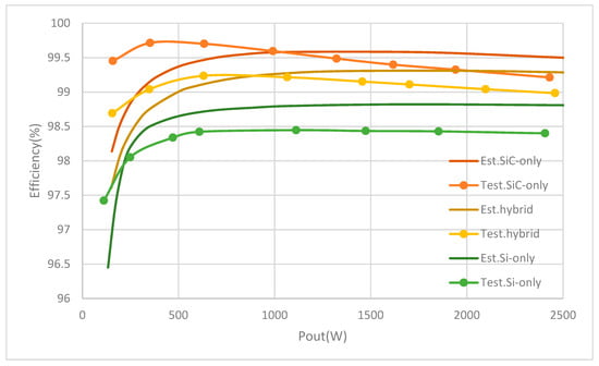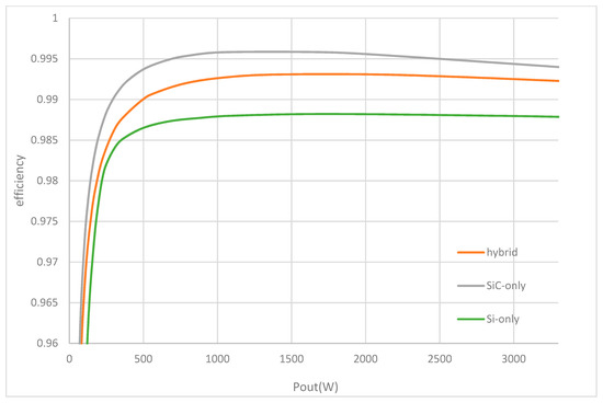 Comparison of the efficiency of the hybrid, Si-only, and SiC-only schemes.