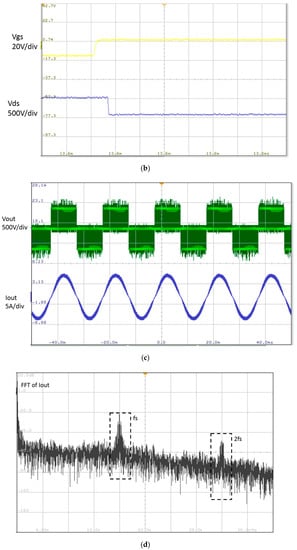 Figure 11a shows the driving waveforms of the proposed modulation. The driving signal of T1 outputs high-frequency PWM wave in half of the power frequency period, and the other half period is constantly low; T2 outputs high-frequency PWM wave in half of the power frequency period, and the other half period is constant high level; T5 outputs a high-frequency PWM wave in half the power frequency period, and the other half period is constantly high. The driving waveforms of T1 and T5 are always complementary. Figure 11b is the waveforms of the drive voltage and the voltage across the device (T1 is taken as an example). When the driving voltage is high, the device is turned on, and the voltage across the device is 0. When the driving voltage is low, the device is turned off, and the voltage across the device is half the DC bus voltage. Figure 11c shows the output voltage and the current waveforms when the output current is 3 A. Figure 11d is the FFT (fast fourier transformation )of Iout.