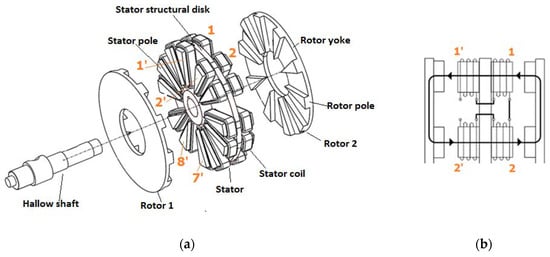 (a) Exploded view of the proposed axial-flux switched reluctance machines (AFSRM) (left), (b) representation of the flux path when there is alignment between stator and rotor poles (right) [15].