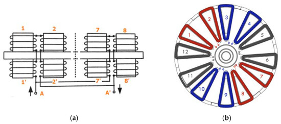 (a) schematic drawing of the coil’s arrangement of the two double electromagnets diametrically opposed (stator poles 1–2 and 7–8) [15], connected in parallel to form phase A. (b) upper view of the layout of the different phases (red: Phase A; blue: Phase B and black: Phase C).