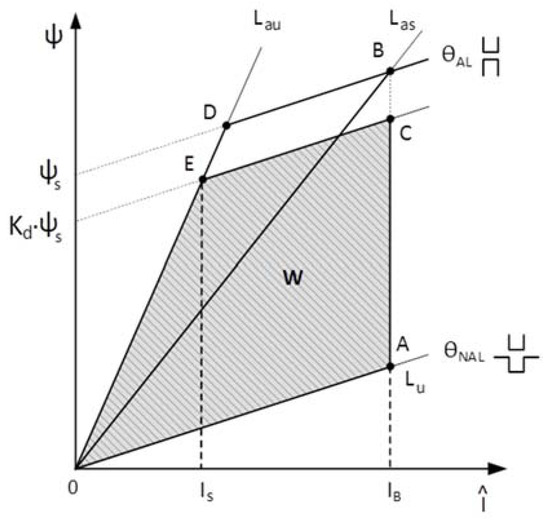 If the phase resistance is neglected and the aligned magnetization curve is approximated by two straight lines, OD with a slope Lau, and DB parallel to the unaligned magnetization curve also a straight line, OA, with a slope Lu [15]. The current between points A and C is flat-topped and has a value of IB, being C the point where solid state switches turn-off in which flux linkage, ψs, is equal to kd Las IB, being Las the saturated inductance, slope of the straight line OB, and kd the magnetic flux linkage ratio.