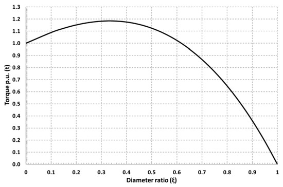 The torque per unit with respect to the diameter ratio is depicted in Figure 4, where it can be seen that the maximum torque per unit is achieved when the diameter ratio is one third, nevertheless good values of ξ can be obtained in the margin between one fifth and one half.
